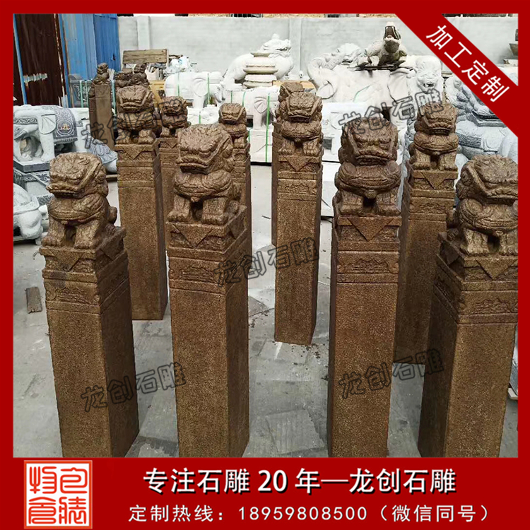 石雕拴馬樁樣式齊全、規(guī)格不一,常見(jiàn)的石雕拴馬樁都是方20cm的柱子,高度在1.5-2.0米之間,其最主要的不同便體現(xiàn)在它最上面的柱頭上。石雕拴馬樁的柱頭雕刻樣式很多,有雕刻獅子的、雕刻麒麟的還有雕刻