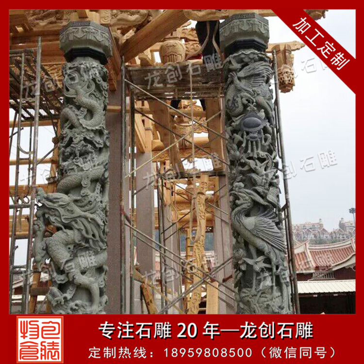 石雕單龍柱是我們經常見到的龍柱類型,因為主要材料是青石,故被稱之為青石龍柱,青龍是中國四大瑞獸之首,左青龍,右白虎,表示的是青龍的一種地位,高于白虎的。青龍柱主要是護宅所用,所以大部分擺放在陵墓,寺廟。