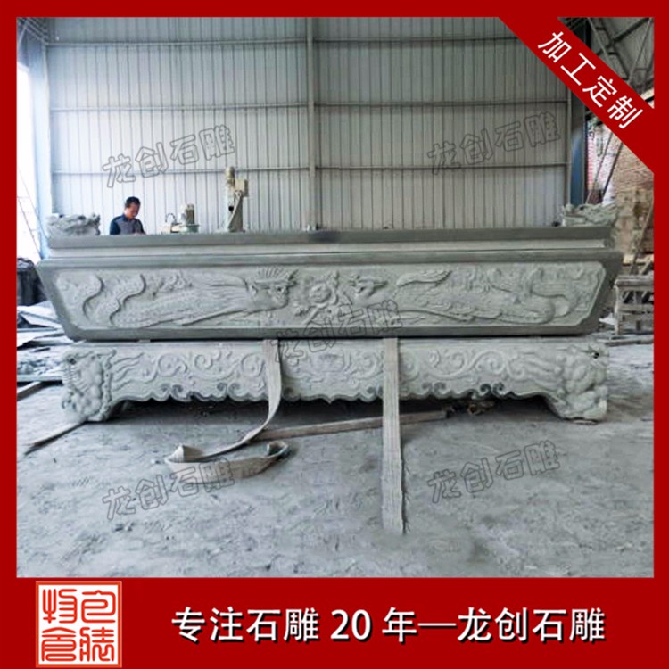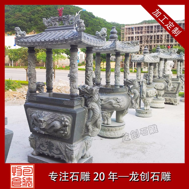 大型石雕香爐的制作石材通常是優(yōu)質(zhì)顏色偏深的花崗巖石料和青石石料,青石本身顏色呈現(xiàn)青色,較為古樸,青石石雕香爐突顯了整個香爐的莊重氛圍,為佛教圣地增添了幾分威嚴。石雕香爐的外形分為圓口、方形口、長方形口,圓口香爐一般是三足兩耳,方形香爐一般是四足兩耳,長方形香爐一般也是四足兩耳,還有少許兩層石雕香爐。