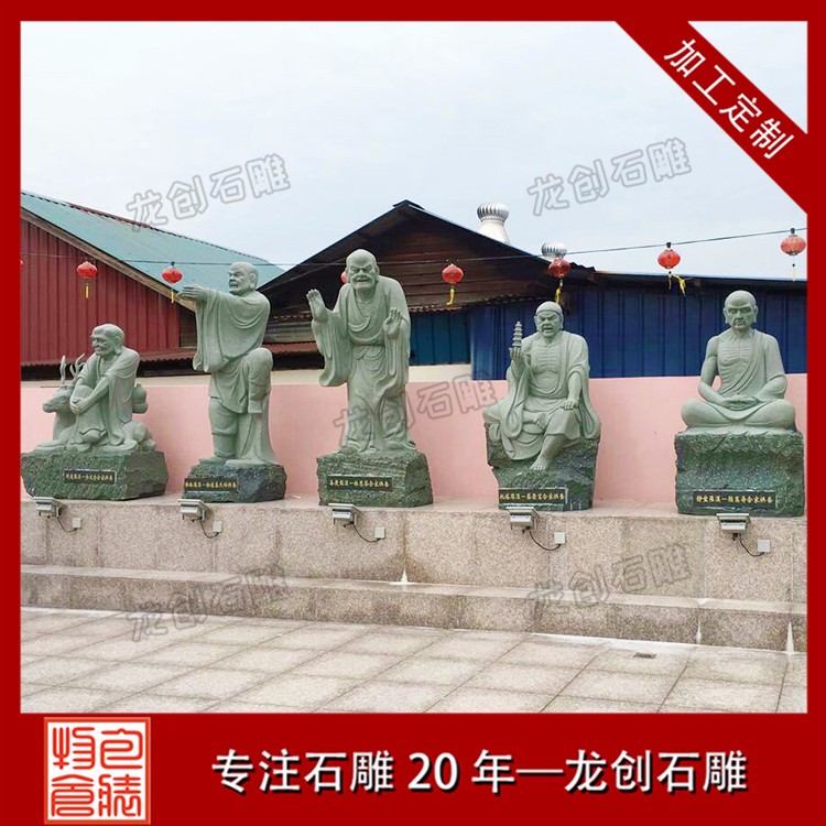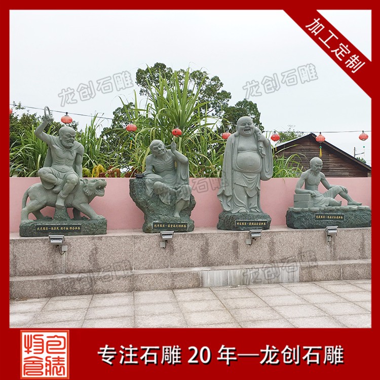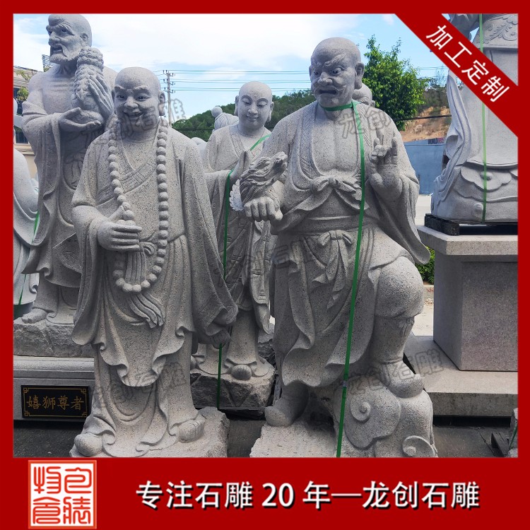 寺廟石雕十八羅漢擺件包括“坐鹿羅漢”、“喜慶羅漢”、“舉缽羅漢”、“托塔羅漢”、“靜坐羅漢”、“過江羅漢”、“騎象羅漢”、“笑獅羅漢”、“開心羅漢”、“探手羅漢”、“沉思羅漢”、“挖耳羅漢”、“布袋羅漢”、“芭蕉羅漢”、“長眉羅漢”、“看門羅漢”、“降龍羅漢”、“伏虎羅漢”。每一尊石雕羅漢形態各異,根據石雕十八羅漢造型基本能辨別出每一尊是什么羅漢。