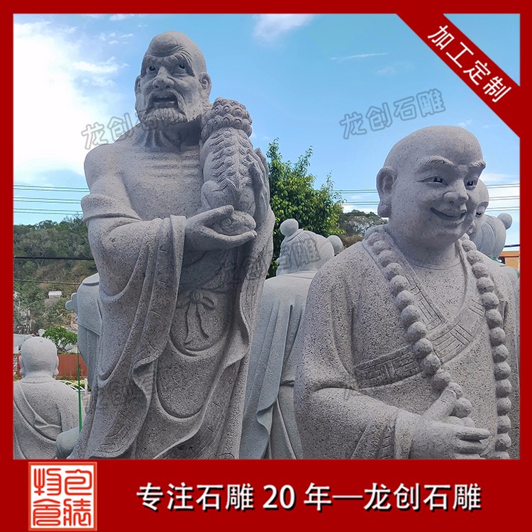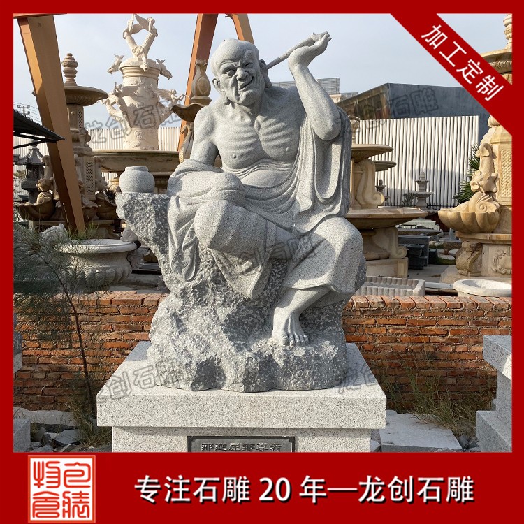 佛教寺廟石雕十八羅漢雕塑一般采用天然石材加工制作而成,有花崗巖(芝麻白、芝麻黑、芝麻灰、蝦紅)、青石等,有的則會用漢白玉石材制作。用于室外擺放石雕十八羅漢像通常建議用花崗巖石材雕刻,按順序擺放在兩側。漢傳佛教的石雕十八羅漢隨著雕塑文化的發展,造型有立像、坐像、坐立結合的三種雕刻方式。從雕刻工藝上區分有浮雕、圓雕、透雕、線雕等,只要質量做工好,不論采用何種形式,都可以按照寺院的需求,很好的將十八羅漢文化表達出來。