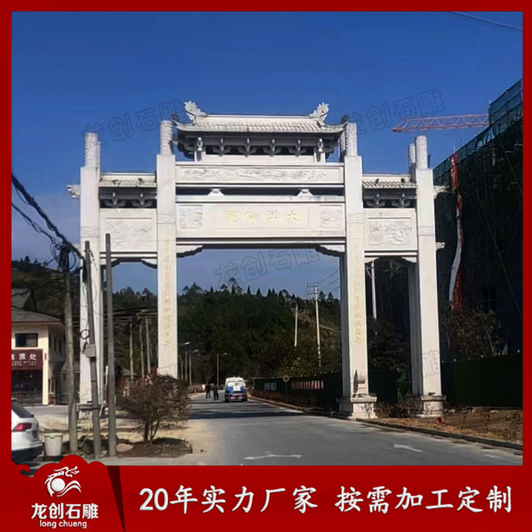 中西方風格融合的現(xiàn)代造型設(shè)計石牌坊,選用傳統(tǒng)式的石牌坊制作樣式,在建筑類型上結(jié)合歐式古典的設(shè)計構(gòu)思,種風格的牌坊看起來豪華而壯觀。許多現(xiàn)代化的鄉(xiāng)鎮(zhèn)喜歡選擇這種類型的牌坊。