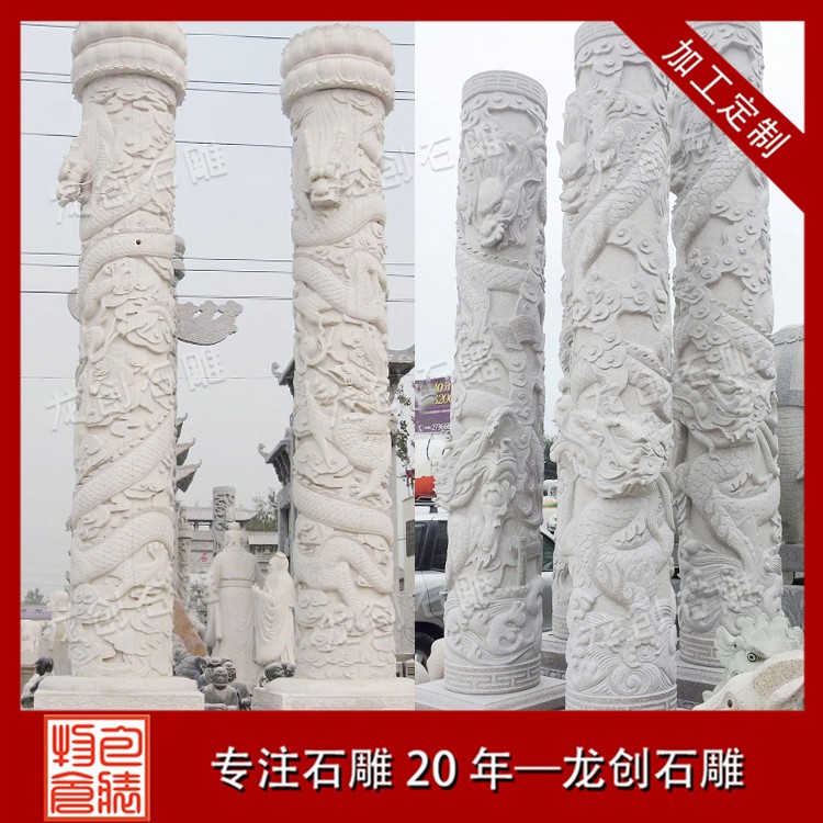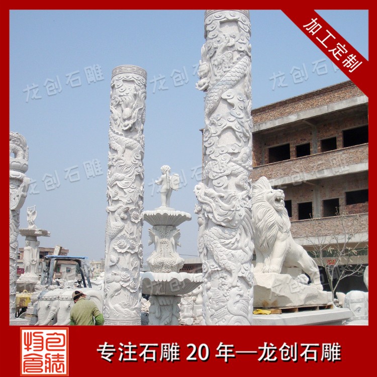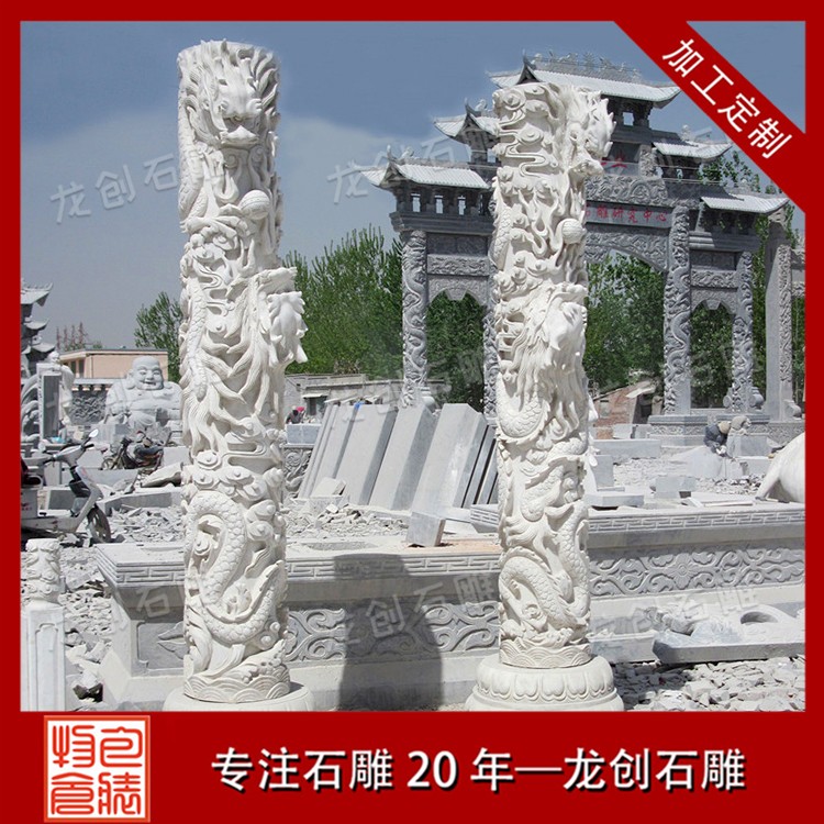 3.漢白玉龍柱。漢白玉石材的硬度、穩(wěn)定性、材質(zhì)等特性在大理石和玉石的特性中間,并且靠近玉石的材質(zhì)特性。所以有些比較有檔次的場(chǎng)所會(huì)選用漢白玉材質(zhì),但是漢白玉石材價(jià)格很貴,一般用來雕刻小型龍柱,如果要雕刻大型石材龍柱還是會(huì)選用青石和花崗巖石材。