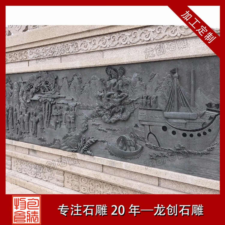 石材浮雕壁畫為圖像造型浮突于石料表面,與沉雕正好相反,是半立體型雕刻品。根據圖像造型脫石深淺程度的不同,又可分為淺浮雕和高浮雕。淺浮雕是單層次雕像,內容比較單一;高浮雕則是多層次造像,內容較為繁復。浮雕的雕刻技藝和表現體裁與圓雕基本相同。古今很多大型紀念性建筑物和高檔府第、民宅都附有此類裝飾,其主要作品是壁堵、花窗和龍柱(早期)及柱礎等。