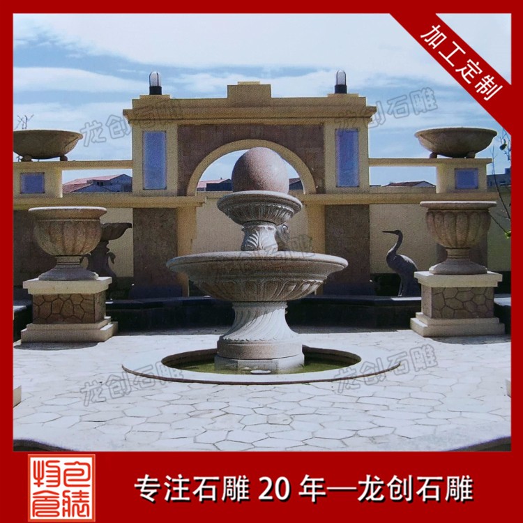 有一種特別的噴泉,上面會帶有一個圓球,叫做石材風水球噴泉,主要特點就是頂部有一個轉動的流水石球,我們稱之為風水球。這類噴泉是比較有中國傳統雕塑特點的。風水球有中國傳統思想中的轉運迎好運的寓意,所以在一些私宅別墅庭院中,常常放置風水球噴泉。福建石材風水球噴泉廠家,選惠安龍創石雕,20年實力廠家,按需加工定制。