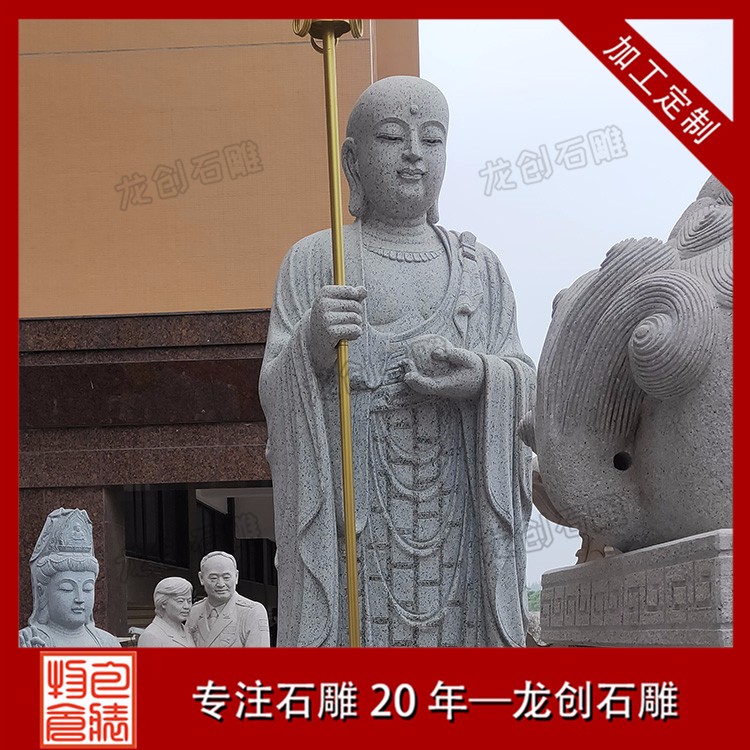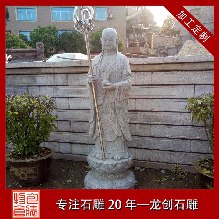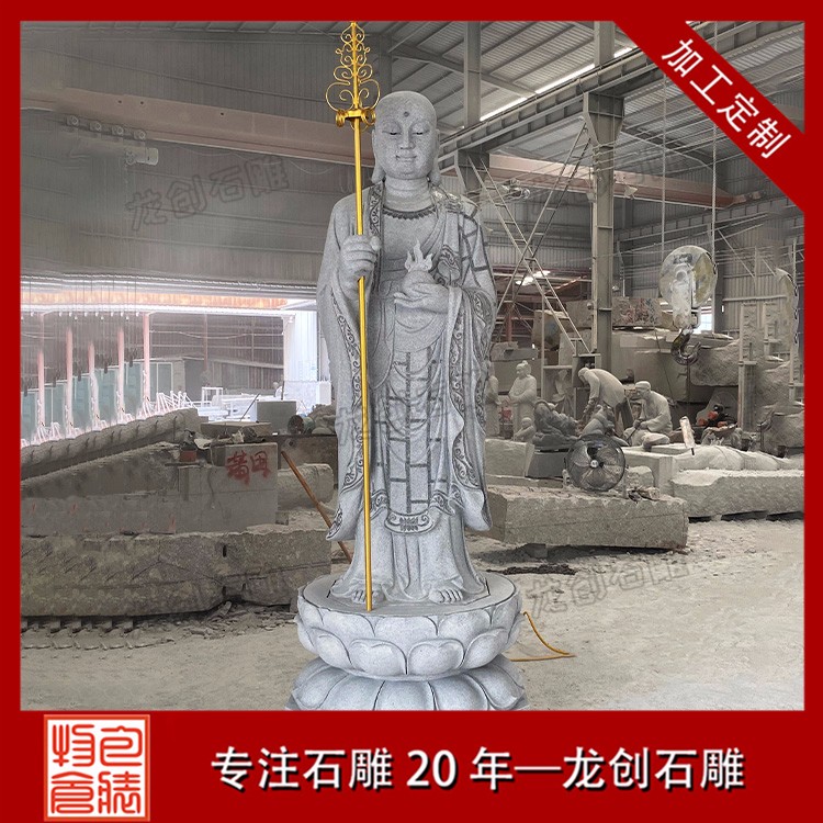 石雕地藏王菩薩圖片形象一般菩薩為頭戴寶冠、身披天衣、瓔珞裝飾的天人相。而地藏菩薩則多為光頭或是頭戴毗盧冠,身披袈裟的出家人之相。一手持錫杖,一手持蓮花,或是手持幡幢、寶珠等。石雕地藏王菩薩價格會根據材質、尺寸和雕刻工藝的變化而變化,具體的價格多少錢,歡迎來電咨詢。