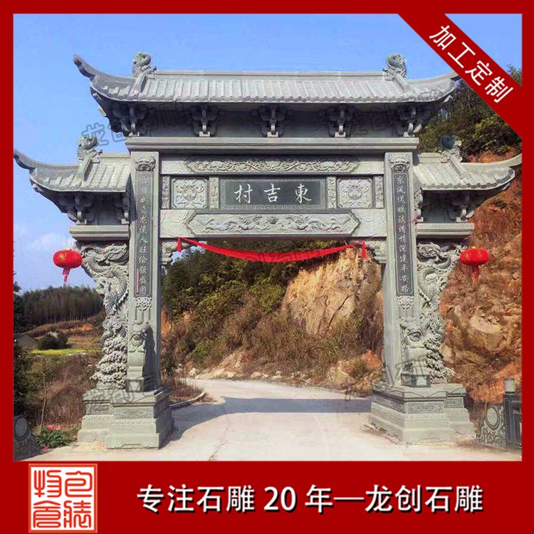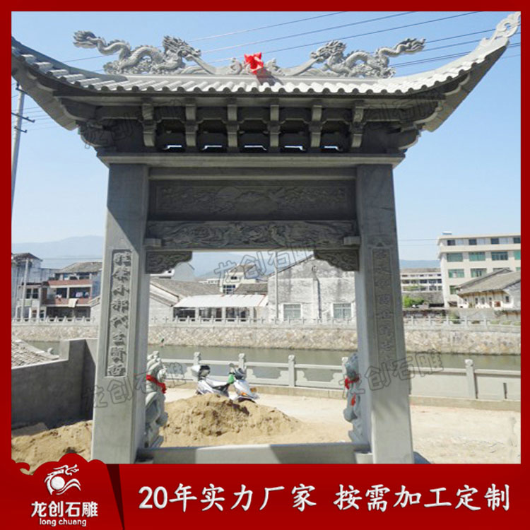 農村單門牌坊也被稱為一門石牌坊、單門牌樓、一門牌樓等;現在單門牌坊在美麗鄉村建設中的使用越來越多,農村單門牌坊及一門簡易石牌坊樣式常見于農村村口處,從石牌坊廠家提供的農村單門牌坊圖片及一門石牌坊樣式大全看,單門牌坊是建造比較多的一種。常見的單門牌坊圖片及一門石牌坊樣式大全,有沖天式單門牌坊、一門一樓單門牌坊、一門三樓單門牌坊等等。