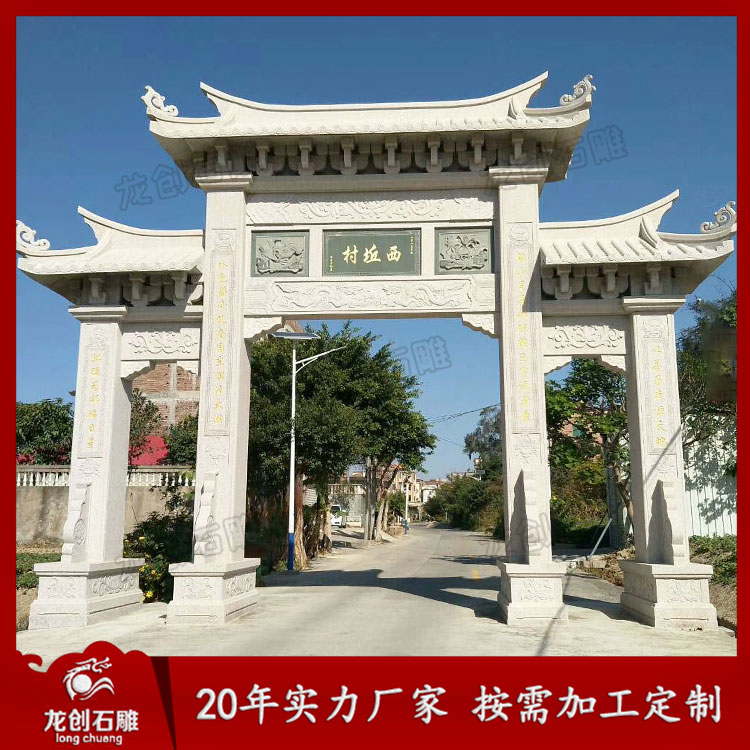 村口牌坊牌樓石雕的興起是一種盛世的象征。村口石牌樓體現了農村經濟繁榮、設施完善、環境優美、文明和諧的社會主義新農村的核心價值,這也是社會主義新農村建設的成功見證之一。