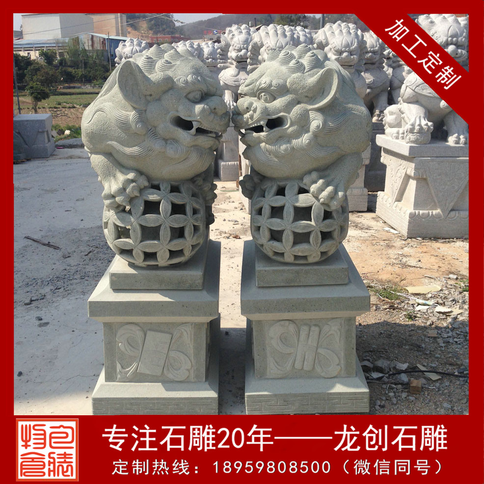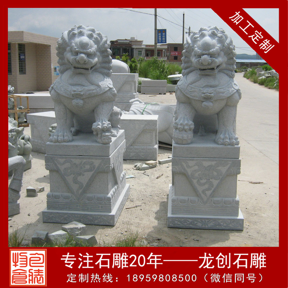 石獅子的造型一般尊嚴而又大氣,是皇jia守衛(wèi)門戶確保皇宮安寧的瑞獸,因為獅子是獸中zhi王,它體態(tài)壯碩雄健、威錳無比、氣勢非常。統(tǒng)治者認為獅子不但可以避邪,還可帶來祥瑞之氣。石雕北京獅為雌雄一對,獅頭飾鬃髦,頸懸響鈴,肌肉發(fā)達,氣勢雄偉。雌獅前左腳下有一幼獅仰臥作嬉戲狀,雄獅前右腳撫踩一繡球。底座有繁縟精致的卷葉紋。石雕北京獅瑞獸一種,百獸zhi王,勇不可擋,威震四方,不但可以避邪,且可帶來祥瑞之氣,能解除多種形煞,亦加強官威或屋主之陽氣,如果窗口見到不利之沖克,如沖煞、天斬煞等,可放一對石獅面向口可化煞,且有生權(quán)之意,適合官職人員擺放,古時衙門前就是擺放獅子鎮(zhèn)守。