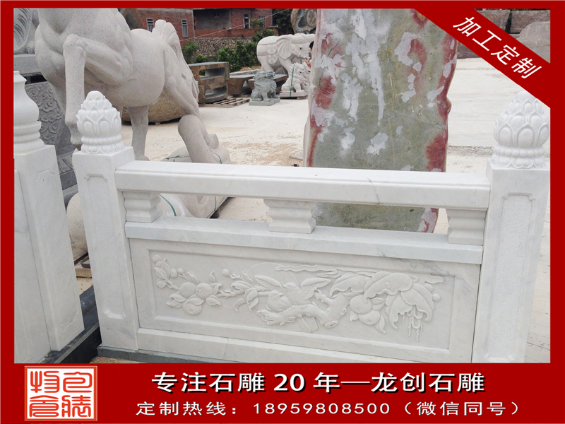 大理石欄桿是我國傳統建筑最常見的組成部分,無論是在走廊、橋邊、花池、園囿、樓閣、臺榭等,都要用欄桿圍護避免發作危險。特別是在園林建筑傍邊,石雕欄桿是不可或缺的,既能夠攔隔圍護,將不同的區域區分開來,又不會將各個區域之間的聯系阻斷,特別是欄桿上的圖畫還能夠點綴環境。