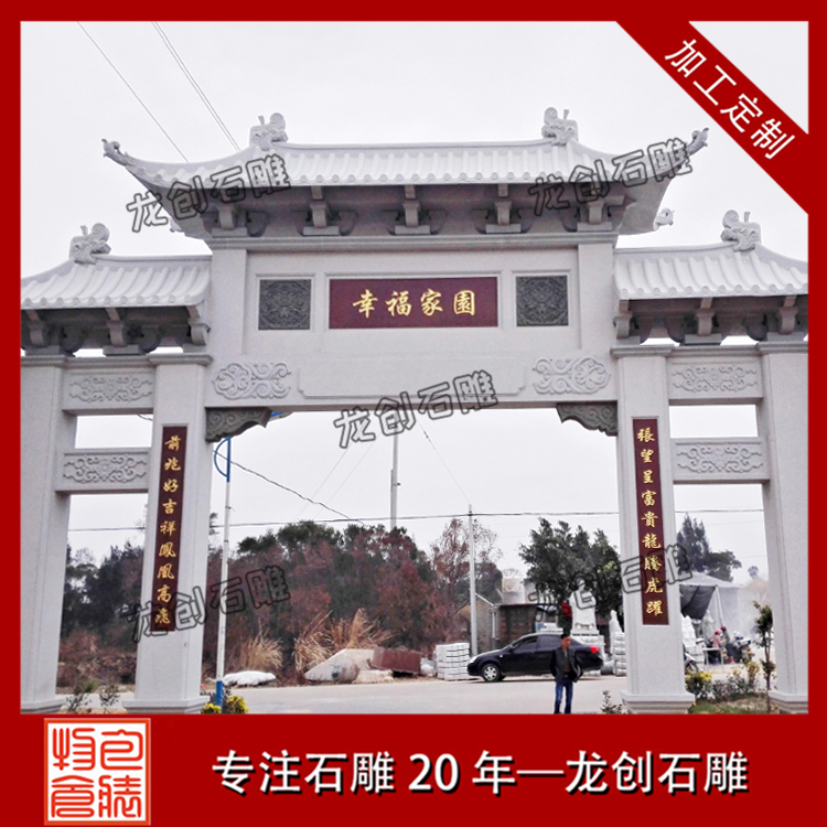 村頭石牌樓制作材質有青石、花崗巖、大理石等,樣式有單門、三門、五門,三樓、五樓、七樓等,雕刻的圖案也是多種多樣,因此村頭石牌樓價格沒有一定的,預算多可選擇的樣式也就多,大理石牌樓價格,請致電我司咨詢,我們會給您一個專業的報價。